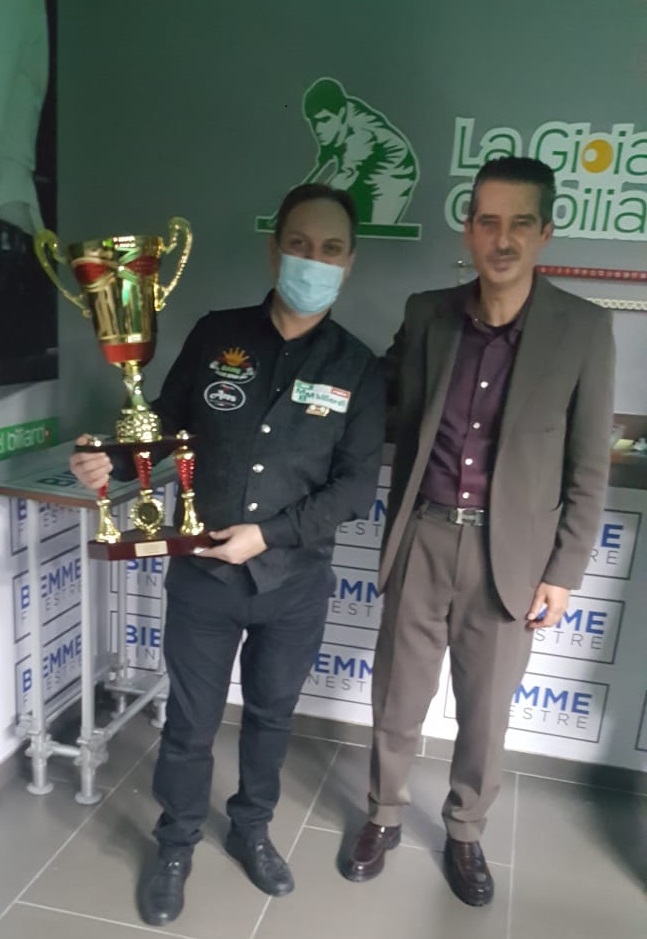 Nella foto il sig. Germanò insieme al vincitore, sig. Davide Rizzo, campione del mondo in carica, che ha battuto in finale il bravo atleta calabrese Cristian Santucci del Csb Palareggio.