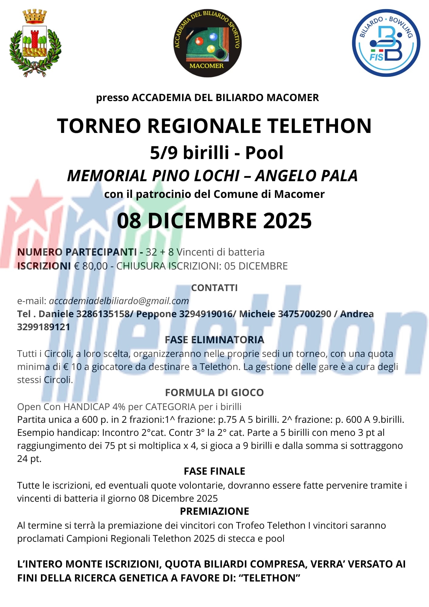 L’iniziativa rappresenta non solo un importante appuntamento sportivo, ma anche un gesto concreto di solidarietà: l’intero monte iscrizioni, comprensivo delle quote biliardi, sarà infatti devoluto a sostegno della ricerca genetica Telethon.