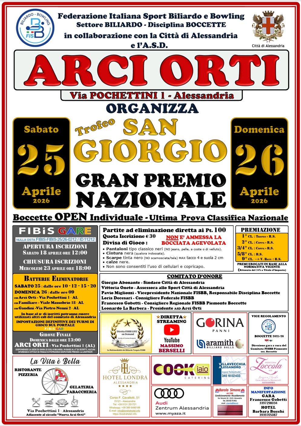 Appuntamento ad Alessandria il 25 aprile per il Gran Premio Nazionale - Boccette Open Individuale Ultima prova Classifica Nazionale.