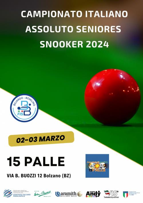 Il prossimo weekend, il 2 e 3 marzo 2023, la sala 15 Palle di Bolzano ospiterà la prova unica del Campionato Italiano Seniores 2024 di snooker.